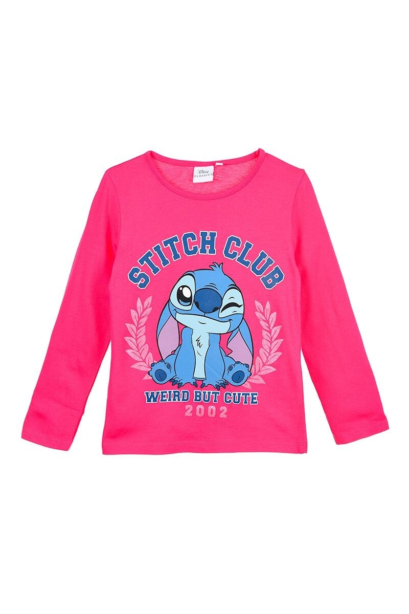 Sluit je aan bij de "Stitch Club"! Dit opvallende, felroze T-shirt met lange mouwen is perfect voor de jonge fans van Disney's ondeugende blauwe alien. Met de tekst "Weird but Cute" en het jaartal "2002" is dit shirt een uniek en trendy item.